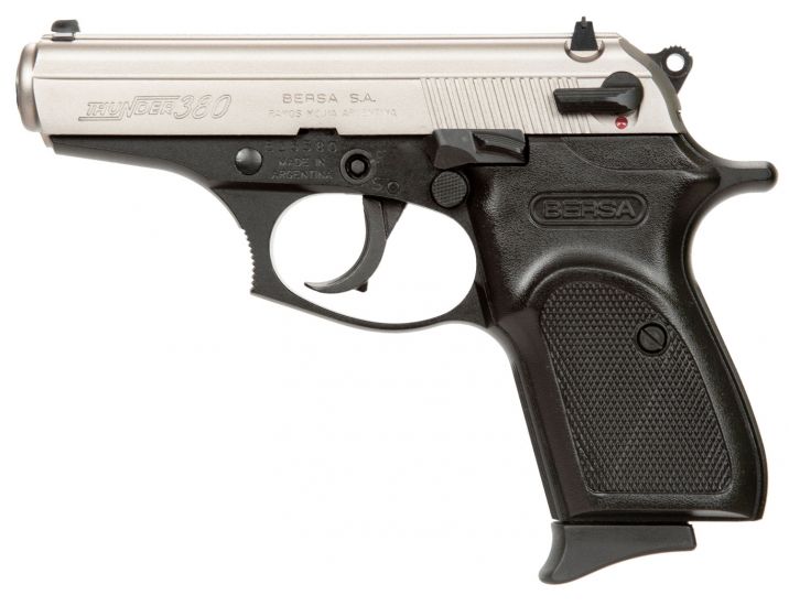 Bersas Thunder 380 is ideal for personal protection and offers accuracy, reliability, versatility in a lightweight, compact design. Its aluminum alloy frame has a combat style trigger guard, integral locking system and decocker safety, and a micro-polished bore with sharp, deep rifling. The steel slide features a 3-dot sight system for the prefect sight picture. The Thunder 380 features an extended finger rest on the bottom of the magazine for comfort.