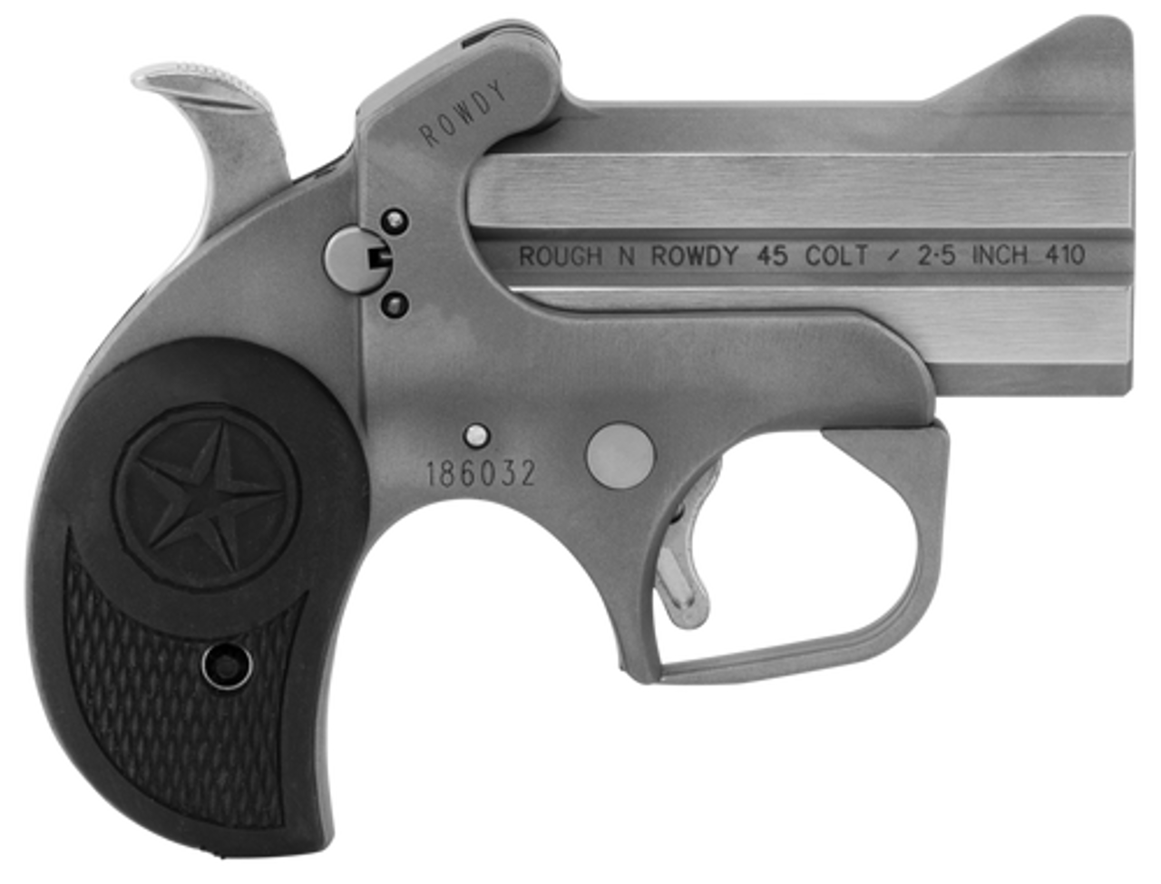 Rowdy is compatible with all standard Bond Arms barrels for easy caliber conversions. The pistol has stainless steel double-barrel and frame, the barrels and trigger are polished and the frame is sand blasted. Features- Automatic spent casting extractor, patented rebounding hammer, retracting firing pins, cross-bolt safety and spring-loaded, cammed locking lever.