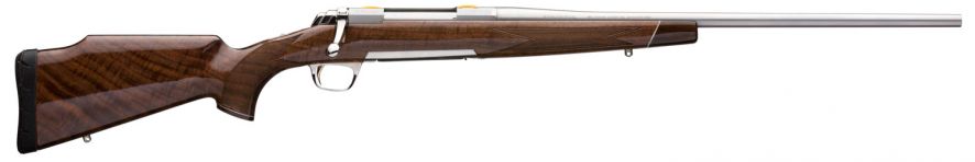 Polished stainless gold engraving gloss walnut & rosewood Monte Carlo detachable rotary magazine short throw bolt adjustable trigger bolt-action – Experience design. Browning has over 50 years of experience with bolt-action high-powered rifles. Today’s X-Bolt rifle inherits the strongest most note-worthy features of its predecessors. The X-Bolt White Gold model has a Monte Carlo stock. This feature is recognized as the comb steps sharply down toward the heel of the buttstock allowing more contact between the recoil pad of the stock and the shooter’s shoulder. With this design the recoil of the fired shell comes directly back or in-line with the stronger part of the inner shoulder making the rifle more pleasant to shoot especially when a long day at the range is expected. – Beautiful? Yes! It is okay for some guns to be referred to as beautiful even though it is still a hard working hunting tool. The X-Bolt White Gold is beautifully adorned with a polished Stainless steel receiver that is drilled and tapped for scope mounts with Engravings both the front and rear. This rifle also has a polished Stainless steel barrel. Its stock is a gloss-finished finely Checkered with a rosewood forend and grip cap. – Action Length: Short Action – Caliber: 6mm Creedmoor – Barrel Length: 22 – Overall Length: 42 – Length of Pull: 13 5/8 – Drop at Comb: 3/4 – Drop at Heel: 1 7/16 – Weight: 6 lbs 8 oz – Magazine Capacity: 4 – Twist Rate: 7 1/2
