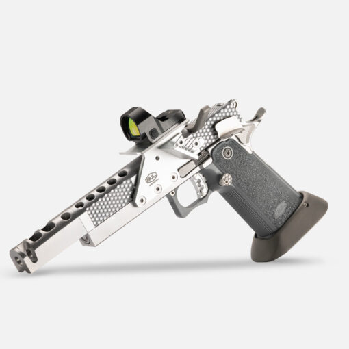 After a year long of development with input from world champion Jorge Ballesteros, we came up with a new breed of an open gun, the Bullesteros. The development started with a new stainless steel grip to add weight to the gun and keep recoil down to a minimum. The trigger guard is ergonomically cut to allow for the highest grip possible. We then fit it with a unique one piece compensated 5.7″ hybrid barrel for a fast and flat shooting experience. To top it all off, the Bullesteros ships with a modular trigger system that has interchangeable trigger shoe inserts, a tool less guide rod, CNC machined & spring loaded competition extractor, shielded ambidextrous safeties and is hand built with the highest attention to detail.