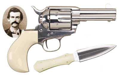 Cimarron Doc Holiday, 45LC, 3.5″ Barrel, Steel Frame, Nickel Finish, Tru Ivory Grips, Fixed Sights, 6Rd, Doc Holiday Engraved Backstrap, Leather Shoulder Holster, Tru Ivory Grip Dagger CA346DOC