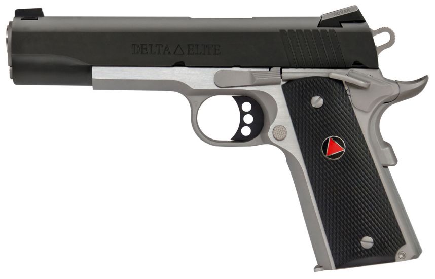 Colts Delta Elite 1911 Government features an upswept beavertail grip safety, extended thumb safety, Novak white dot sights with a Low Mount Carry rear, and composite grips with Delta medallion. Comes with 1 magazine.