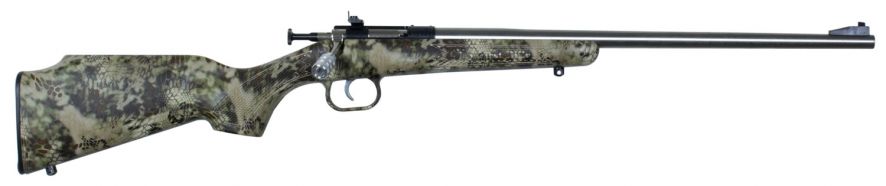 This Crickett rifle features a stainless steel threaded bolt knob, Kryptek Banshee synthetic stock, and a blued 16.125 barrel.