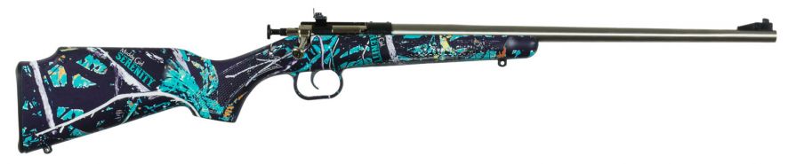 Cricketts Single Shot 22 LR rifle features a Muddy Girl Serenity synthetic stock, and adjustable rear/fixed front sights, and a bolt action constructed from alloy nickel plated steel.