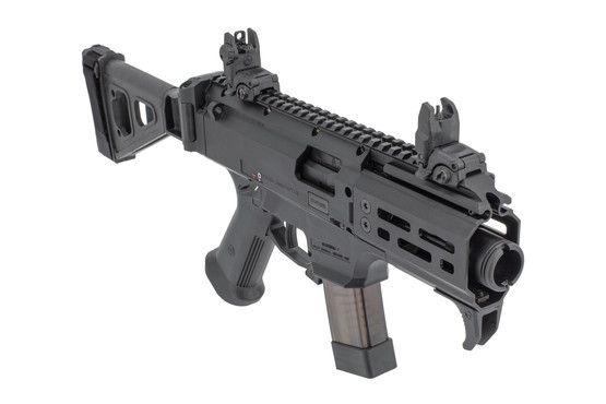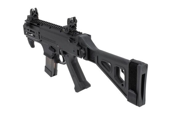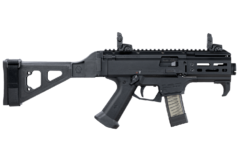 The CZ Scorpion EVO3 S2 Micro 9mm has a 4” barrel, HB Industries short handguard and a folding SB Tactical brace. Replacing the previous Micro that was equipped with a collapsible brace, this version also gets a more minimal flash can muzzle device and Magpul MBUS back-up iron sights.