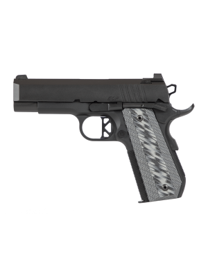 With a compact, stainless steel slide and a forged aluminum frame, weight is kept to a svelte 29 oz. Our new tapered G10 grips and a bobbed mainspring housing enhance its ergonomics, affording shooters with smaller hands an easier reach to the trigger.
