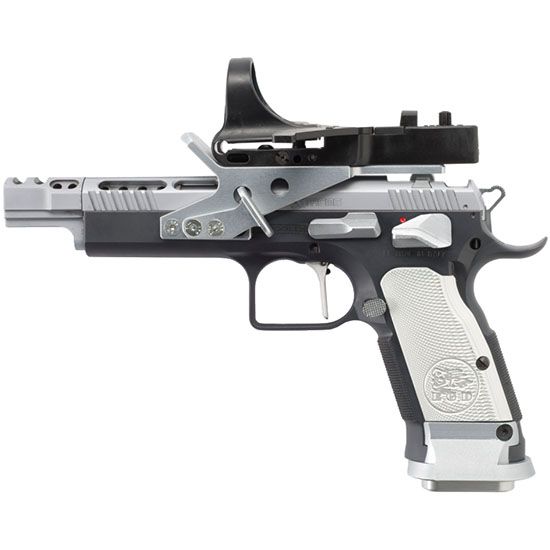 Caliber: 38SUP – Capacity: 17 – Barrel Length: 5.25 – Overall Length: 10.5 – Width: 1.4 – Height: 5 – Weight: 3 lbs – Features Include: – industrial Two-Toned Ceramic Coating – Coned Ported Barrel with Polygonal Rifling – Lighten Ported Slide – Compensator – Ambidextrous Safety – Xtreme Aluminum Grips – Xtreme Hammer – Xtreme Adjustable S/A Trigger – Xtreme Guide Rod – Xtreme Firing Pin Xtreme Firing Pin Safety – Xtreme Hammer Spring – Extended Mag Well – Scope Mount with Blast – Shield N Slide – Racker – Thumb Rest – Custom Reversible Magazine Release – Large Slide Serrations for Ease in Operation