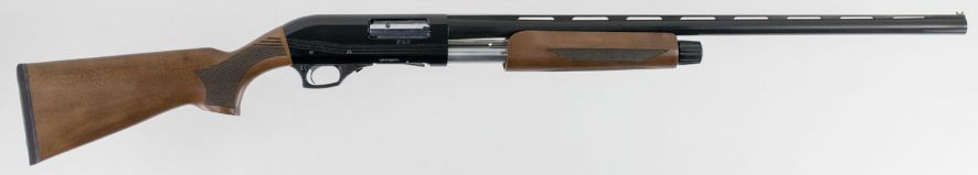 This pump action shotgun features a black receiver and barrel finish, a wood stock, and a cross-bolt safety.