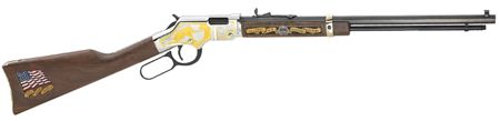 The Military Service Tribute Edition is based on the Golden Boy with the same adjustable sights, octagonal barrel, walnut furniture, and half-cock safety notch on the hammer. It features a highly-polished nickeled receiver cover and add intricate scrollwork and the majestic American bald eagle surrounding a shield bearing the words IN RECOGNITION OF MILITARY SERVICE TO OUR GREAT COUNTRY on the right side, and on the left side the Statue Of Liberty. The recognition SALUTING OUR MILITARY HEROES is cut into the surface on both sides between the front and rear panels; the full-color Stars and Stripes are laser-etched and hand painted along with the words GOD BLESS AMERICA on the stock s right side.