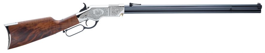 The Henry original silver deluxe engraved rifle features a lever action and an octagon blued steel barrel. It utilizes a steel receiver with engraving, split magazine with external follower, a rotating barrel collar for front-end loading, a presentation-grade American Walnut stock and a distinctive crescent buttplate with the cleaning rod trapdoor. This Silver Deluxe Engraved version uses a brass frame, but with an electroless nickel plating on the frame, buttplate, shell carrier, and magazine cartridge follower.