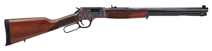 This Big Boy Color Case Hardened model is chambered in 44 Magnum/.44 Spl and features a case hardened receiver finish, American Walnut stock, a blued octagon steel barrel, and adjustable semi-buckhorn rear and brass bead front sights.