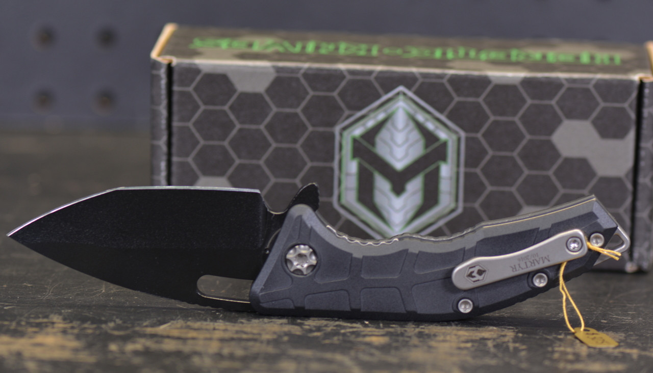 This Martyr model features a black finished tanto blade made from CPM-154 stainless steel. It has a black aluminum handle with a bead blasted pocket clip, backspacer, and matching hardware.