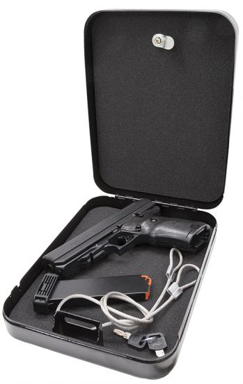 The Home Security Package combines the 45 ACP pistol with a strong and secure lock box. Constructed of heavy-duty overlap pry-resistant, 18-gauge powder coated steel, the lock box measures 11.5 x 8.5 x 1.5 and is fitted with a half-inch memory foam liner. It includes a cable and matched number keys.