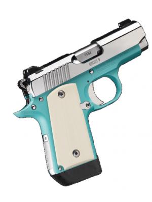 Ivory Micarta grips complement the unique Bel Air Blue frame and mirror-polished slide of the Micro 9 Bel Air, a 9MM model ideal for concealed carry.