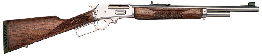 Lightweight and hard-hitting this lever-action carbine is the rifle of choice for many professional hunting guides. – 45-70 Gov’t. – 4-shot tubular magazine – Lever action; side ejection; stainless steel receiver barrel lever trigger guard plate magazine tube and loading gate; hammer block safety – American black walnut straight-grip stock; cut checkering; ventilated recoil pad; tough Mar-Shield finish; swivel studs – 18.5 barrel with deep-cut Ballard-type rifling (6 grooves) – 1:20 twist rate – Adjustable semi-buckhorn folding rear sight ramp front sight with brass bead and Wide-Scan hood. Solid-top receiver tapped for scope mount. – 37 long – 13 3/8