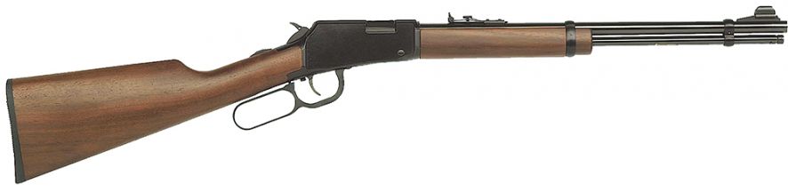 Mossbergs 464 rimfire rifle cosmetically looks exactly like youd expect a traditional, western style lever action carbine. The buttstock sports a straight grip and a squarish lever, while the forend is secured with a steel barrel band. An 18 barrel and a full-length under-barrel magazine complete the picture.