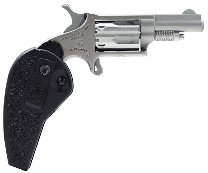 The Mini-Revolver series by North American Arms offers a lightweight concealed carry pocket gun with a 5-shot capacity. Using the half-way notch cylinder, the hammer may rest safely and securely away from live or empty chambers without chance of accidental discharge. The steel frame is fitted with a handy locking black holster grip with a pocket clip and fixed blade front sight. The holster grip unfolds and locks to become the handle of the gun. Press the release button and the mini-revolver folds back into the grip. For added safety, when the holster grip is folded, the trigger of the gun is completely enclosed making it virtually impossible for the gun to be fired.