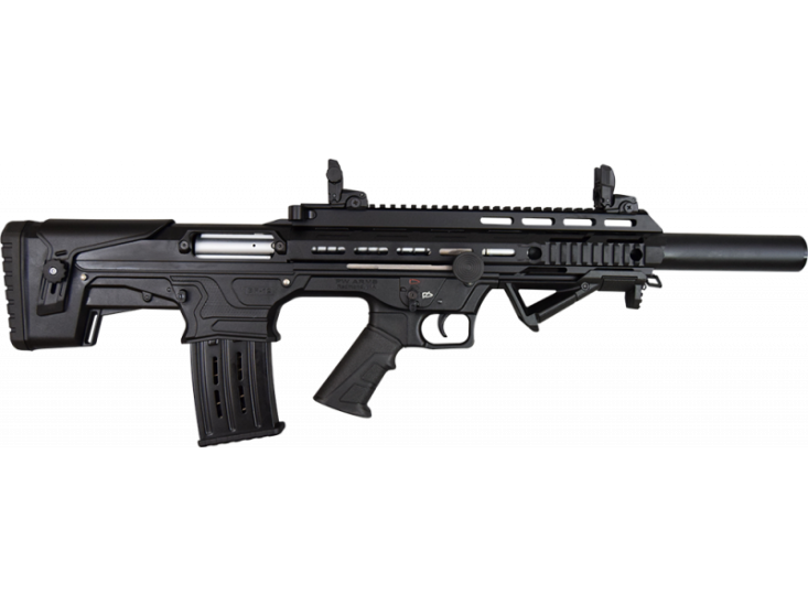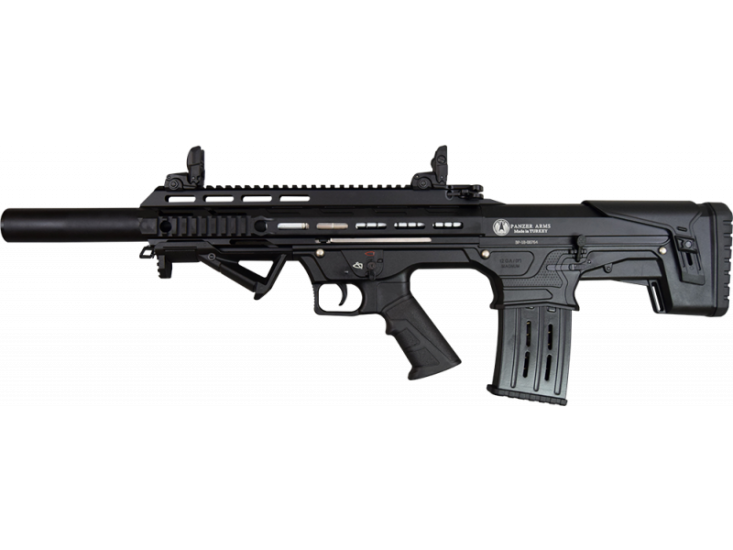 Panzer Arms BP-12 Bullpup Shotgun 12ga, is the newest shotgun offered by Panzer Arms of Turkey. It is very similar to the Panzer Arms AR-12, and the controls are completely ambidextrous. The BP-12 comes with two 5 round magazines, removable angled forward grip, flip up sights, and a cleaning kit. There are picatinny rails along the top of the receiver and on the sides and bottom of the handguard. To allow for easy mounting of optics or accessories. This bullpup shotgun has a top AR-15 style charging handle to accommodate both left and right handed shooters. It also has a side charging handle for right handed shooters.