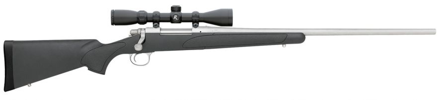 The Remington 700 ADL features a scope, manual thumb safety, a satin stainless metal finish, and a stainless steel barrel and receiver.