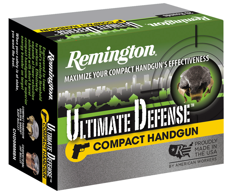 Ultimate Defense Compact Handgun ammo is designed with the concealed carry permit holder in mind to deliver big gun terminal performance out of shorter-barreled pistols and revolvers. Specially-engineered Golden Saber BJHP bullets effectively expand at lower velocities for superior energy transfer on target. This round has been engineered to provide optimal penetration and expansion through even heavy clothing at lower velocities for maximum stopping power. It is all of Remington Ammunition’s premium features finely tuned for your most important handgun.