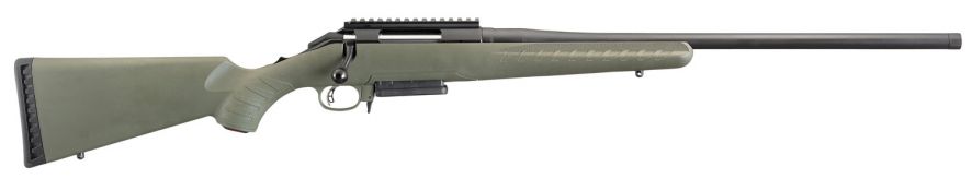 Rugers American Rifle offers minute-of-angle accuracy that can make every hunt a success. The one-piece, three-lug bolt with 70 degree throw provides ample scope clearance and utilizes a full diameter bolt body and dual cocking cams for smooth, easy cycling. Its patent-pending Power Bedding, integral bedding block system positively locates the receiver and free-floats the barrel for outstanding accuracy. The ergonomic, lightweight synthetic stock with soft rubber buttpad is designed for quick, easy handling and blends a classic look with modern forend contouring and grip serrations. The American Rifle also has a Ruger Marksman adjustable trigger, cold hammer-forged barrel, and a tang safety.