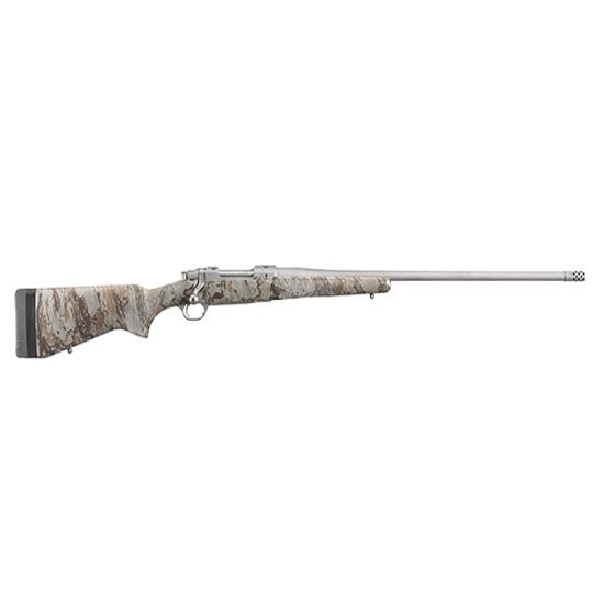 Caliber: 300 Win Mag – Stock: Natural Gear Camo Laminate – Sights: None – Barrel Length: 24 – Material: Stainless Steel – Thread Pattern: 1/2-24 – Twist: 1:10 RH – Capacity: 3 – Finish: Hawkeye Matte Stainless – Weight: 8.2 lbs. – Overall Length: 43.25-44.75 – Length of Pull: 12.75-14.25 – Grooves: 6 – Non-rotating Mauser-type controlled round feed extractor is the most positive case extraction system ever invented and features a fixed blade-type ejector that positively ejects the empty cases as the bolt is moved fully rearward. – Hinged solid-steel floorplate for easy unloading without having to chamber each cartridge. Features an engraved FTW logo and patented latch that is flush with the trigger guard to avoid accidental dumping of cartridges. – Three-position safety is easily accessible and allows the shooter to lock the bolt or to load and unload the rifle with the safety engaged. – Cold hammer-forged barrel results in ultra-precise rifling that provides exceptional accuracy longevity and easy cleaning. – Patented integral scope mounts machined directly on the solid-steel receiver provide a stable mounting surface for scope rings eliminating a potential source of looseness and inaccuracy in the field (scope rings included). – Ergonomically pleasing stock features a soft rubber buttpad with buttpad spacers that allow the rifle to be properly sized for different shooters or varying levels of outerwear (three 1/2 spacers included). – Also includes: rugged one-piece stainless steel bolt; studs for mounting sling swivels. – The Ruger