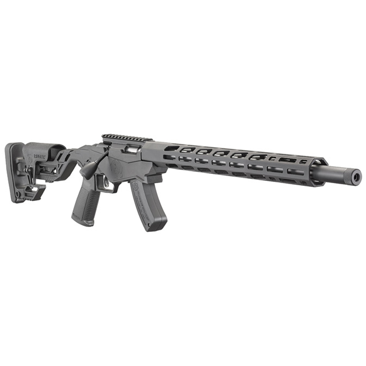 Ruger Precision Rimfire Black Bolt Action Rifle – 22 Long Rifle – The Ruger Precision Rimfire rifle features a molded, one-piece chassis and a Quick-Fit adjustable buttstock assembly manufactured with glass-filled nylon for strength, stiffness, and stability. The adjustable buttstock also has a flat Picatinny bag rider, molded-in window which provides a tether point for your squeeze bag, and a metal QD pocket. The free-float handguard is made of aluminum and features Magpul M-Lok slots on all four sides, while the Picatinny scope base includes 30 MOA elevation. The target, cold hammer-forged, 4140 alloy steel barrel has ultra-precise rifling and 1/2in-28 threads with an included thread protector. The Precision Rimfire rifle also has a Ruger Marksman adjustable trigger, AR-pattern pistol grip, safety selector, and an oversized bolt handle. May Be Configured With Most AR-Style Grips/Selectors Ruger Marksman Adjustable Trigger Accepts All 10/22 Magazines Oversized Bolt Handle