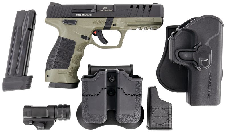 The SAR USA SAR9X Pistol delivers high performance, reliability, and accuracy. It comes chambered in 9mm with a 4.40 inch barrel. Features include adjustable sights, an interchangeable backstrap grip, an OD green polymer frame with a picatinny rail and finger grooves, and one 17 and one 19 round magazine. Includes holster, double magazine pouch, magazine reloader, rail mounted flashlight and grip inserts. Buy guns online from the best online gun store and get semi-automatic handguns for sale from GrabAGun today!