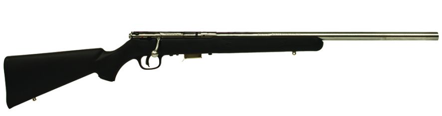 The 93R17 FVSS bolt action rifles helps heighten the fun of rimfire shooting while maintaining Savage standards of meticulous crafting with the balance of modern, high-tech methods and old-world hand craftsmanship. It has a built-in adjustability AccuTrigger that provides a crisp, clean trigger pull, which enhances accuracy. This model features a stainless steel heavy varmint barrel, black synthetic stock with cut checkering, a detachable box magazine and a two-position safety immediately behind the bolt handle at the right rear of the action.