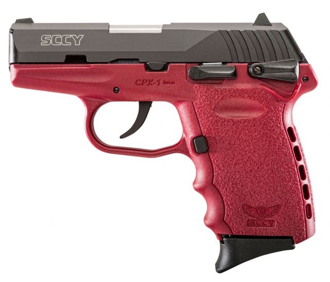SCCYs CPX-1 is designed for concealed carry but large enough to get a good firm grip. It is considered to be one of the best priced, precision made Pocket Pistols on the market. Chambered for 9mm, it has a 3.1 barrel with a 16:1 right hand twist. The receiver is made from 7075 T6 aircraft grade heat treated aluminum alloy. The Zytel polymer frame features ergonomic finger grooves and an integral recoil cushion on the backstrap. The slide is machined from stainless steel with a Zytel overmolded polymer extension for ease of operation. It has 3-dot sights with a windage-adjustable rear. This DAO has an internal hammer with inertial firing pin to prevent accidental discharge, and an external thumb safety with a guard molded into the frame. It has a smooth, consistent 9-pound trigger pull. It comes with two 10-round magazines with finger extensions bases installed and two flat magazine bases. This CPC-1 has a black nitride slide with a crimson frame.
