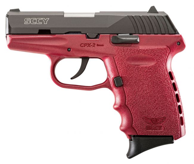 SCCYs CPX-2 is designed for concealed carry but large enough to get a good firm grip. It is considered to be one of the best priced, precision made Pocket Pistols on the market. Chambered for 9mm, it has a 3.1 barrel with a 16:1 right hand twist. The receiver is made from 7075 T6 aircraft grade heat treated aluminum alloy. The Zytel polymer frame features ergonomic finger grooves and an integral recoil cushion on the backstrap. The slide is machined from stainless steel with a Zytel overmolded polymer extension for ease of operation. It has 3-dot sights with a windage-adjustable rear. This DAO has an internal hammer with inertial firing pin to prevent accidental discharge. It has a smooth, consistent 9-pound trigger pull. It comes with two 10-round magazines with finger extensions bases installed and two flat magazine bases. This CPX-2 has a black nitride slide with a crimson frame.