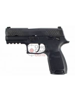 This P320 Compact is chambered in .45 ACP and has night sights and a manual safety. It is designed for Massachusetts compliance.
