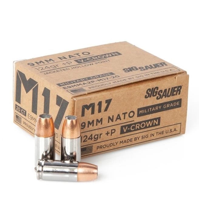 This particular line of M17 Military Grade features a V-Crown Jacketed Hollow Point projectile loaded into quality brass cases. The nickel coated brass cases are reloadable and feature a quality boxer primer. Using non corrosive powders and primers SIG Sauer M17 Military Grade V-Crown is a high quality load that is ideal for personal protection or self defense applications.