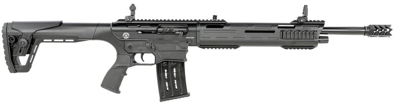 This AR Style, 12 ga. gas operated semi auto shotgun features a 3 chamber, 19.5″ smooth bore barrel, door breacher style muzzle brake, polymer fore end with picatinny rail sections, pistol grip butt stock, and two magazines (2-and 5- shell). The two piece fore end is easily removed for quick and easy access for cleaning. Magazines Guaranteed compatible with Rock Island Armory VR80, VR60, VRBP-100, Panzer Arms AR-12, AR-12 PRO and BP-12, MKA 1919, BR-99 and FR-98/99 Shotguns.
