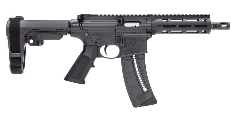 The M&P15-22 Pistol features a M&P handguard with M-LOK slots, 2 position safety, SB Tactical SBA3 adjustable arm brace, and a full length Picatinny-style rail. It utilizes a one-point QD sling swivel attachment point and a threaded barrel with a flash suppressor. Included is one 25-round magazine.