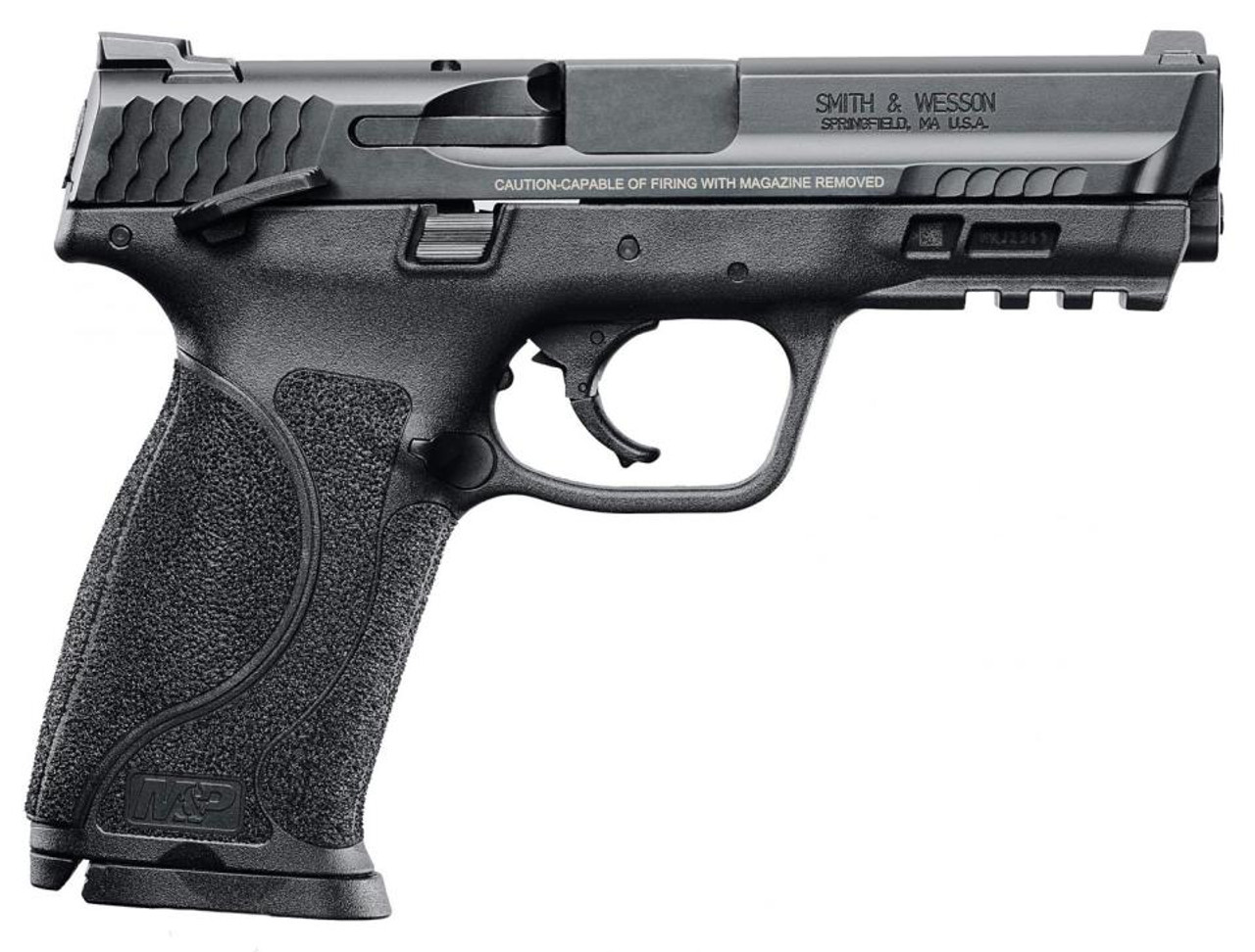 Striker fire action. Full size polymer frame. Stainless steel barrel and slide with Armornite finish. Crisp M&P M2.0 crisp trigger with lighter trigger pull. Tactile and audible trigger reset. Interchangeable palmswell grip inserts for optimal hand fit and trigger reach. High grip to barrel axis. Polymer grips with aggressive texturing. No magazine safety. White dot front sight; low mount whtie two dot rear sight.