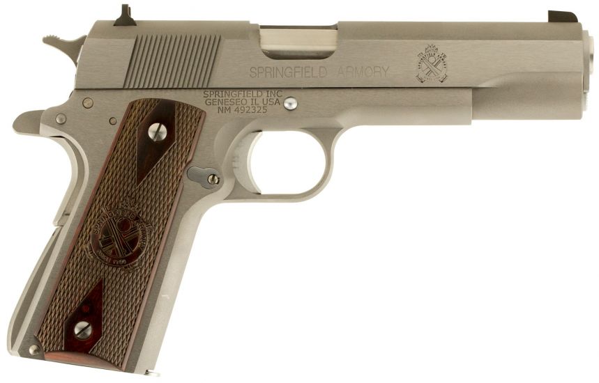 The 1911 Mil-Spec is built on a full-size frame and slide with a match grade, forged stainless steel 5 barrel. Its slide features rear slanted serrations. The mainspring housing is the original arched style found on GI issue 1911-A1s, but it includes the Springfield Armory I.L.S. Each Mil-Spec comes with a beautiful pair of cross-cannon emblazoned Cocobolo grips held in place with slotted grip screws.
