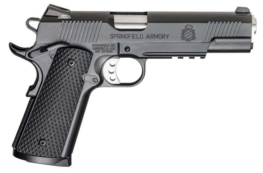 Springfield Armorys Loaded pistol features an extended ambidextrous thumb safety, beavertail grip safety, lightweight delta hammer, and an extended trigger enhance handling and performance in any situation. This model has a black carbon steel slide, black hardcoat anodized frame with an integral accessory rail, and black G10 grips. Its barrel is a 5 stainless steel match grade with a low profile combat, 3-Dot Tritium sight. It also comes with two (2) 8-round magazines and a range bag.