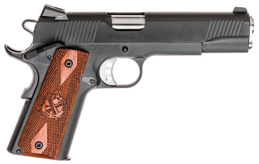Springfield Armorys Loaded pistol features an extended ambidextrous thumb safety, beavertail grip safety, lightweight delta hammer, and an extended trigger that enhances handling and performance in any situation. This model has a black parkerized carbon steel slide and frame, and Cross Cannon double diamond Cocobolo grip. Its barrel is a 5 stainless steel match grade with a low profile combat, 3-Dot Tritium sight.