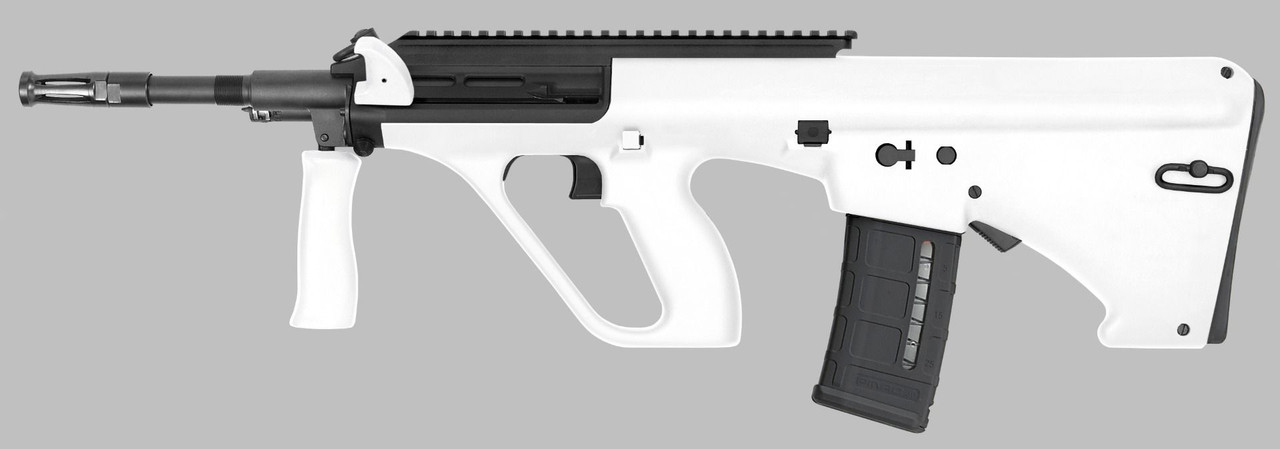 The AUG A3 M1 stock, cocking piece and forward grip are made of highly durable synthetic and are available in Black, Green, Mud and White colors. The rifle is available in either the standard version that accepts genuine Steyr AUG magazines or as a NATO version that accepts standard STANAG (AR) magazines.