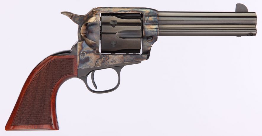 Taylors & Co. is proud to offer the Runnin Iron, a light, efficient, balanced single-action pistol designed specifically for the sport of mounted shooting. Offered in stainless steel or blue finish, the Runnin Iron features a low and wide hammer spur, a wide trigger, second-generation transverse cylinder pin latch, crescent-style ejector rod, reduced-power spring kit, and extra clearance at the front and rear of the cylinder. These features make the Runnin Iron the lightest and most efficient mounted shooting gun on the market. These Runnin Iron models have one-piece, gunfighter-style grips in checkered walnut. The Runnin Iron comes ready to shoot, out of the box, with no additional modifications needed.