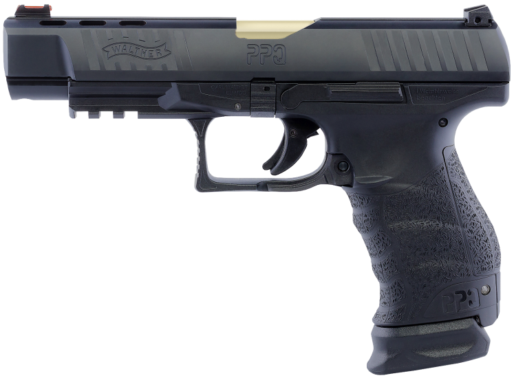 Walther PPQ M1 5” White Gold Barrel with Ported Slide. It is widely accepted that the Walther paddle magazine release is the fastest, most efficient, reloading mechanism available today. While most consumers in the U.S are accustomed to a button release, the awareness of the paddle release and its advantages is growing. The new PPQ M1 5” includes the standard PPQ trigger, the undisputed best factory trigger on a striker fired pistol available today. The new Walther PPQ M1 5” comes with an upgraded red fiber optic front sight, just like the Walther Q5 Match. It also comes standard with one 17 round extended magazine and one standard 15 round magazine. The PPQ M1 5” features the PPQ polygonal rifled 5” barrel. Firearm carries Walther’s Legendary Limited Lifetime Warranty. *Custom PVD coating is covered for a period of 2 Years from date of purchase by Gunbuyer.com.