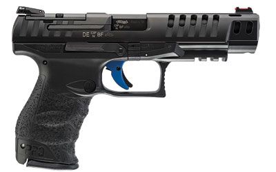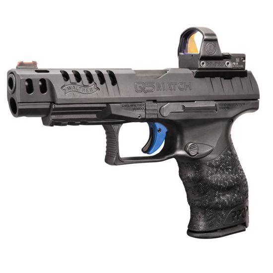 The new Q5 Match from Walther is built for the production class competitive shooter. Built around our award winning PPQ platform, the Q5 Match features an optics ready slide that comes with a Trijicon RMR, Leupold Delta Point, and Docter Optics ready mounting plate in addition to the standard competition iron sights already included. Coupled with a ported slide, Carl Walther signature ergonomics, and a blue quick defense trigger, the Q5 is the firearm that gives you match performance in a production class firearm. **Pictured optics not included.