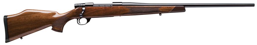 Weatherbys Vanguard rifles are guaranteed to shoot a 3-shot group of .99 or less at 100 yards (SUB-MOA) from a cold barrel when used with Weatherby factory or premium ammunition. Vanguard rifles are equipped with a match quality, two-stage trigger (adjustable down to 2.5 lbs.) and a 3-position safety, with the middle position allowing the shooter to work the action while safety is still engaged. The Vanguard action incorporates a one-piece machined bolt body, fluted for reduction in weight and bearing surface area, while eliminating binding for smooth action. Three gas ports allow high-pressure gases to escape laterally in the event of an accidental case rupture, and the massive M-16-style extractor ensures reliable and positive extraction. Vanguard rifles have a one-piece machined receiver featuring an integral recoil lug for the utmost in strength and structural integrity, along with a one-piece trigger guard with a hinged floorplate for easy access to unfired cartridges in the magazine. The Vanguard Deluxe model offers traditional styling while maintaining Vanguards dependable accuracy. The raised comb Monte Carlo stock is made of AA grade Claro walnut and features rosewood forend and grip caps with maplewood spacers, fineline checkering, and a high gloss finish. The chrome-moly metalwork has a high lustre blued finish.